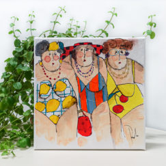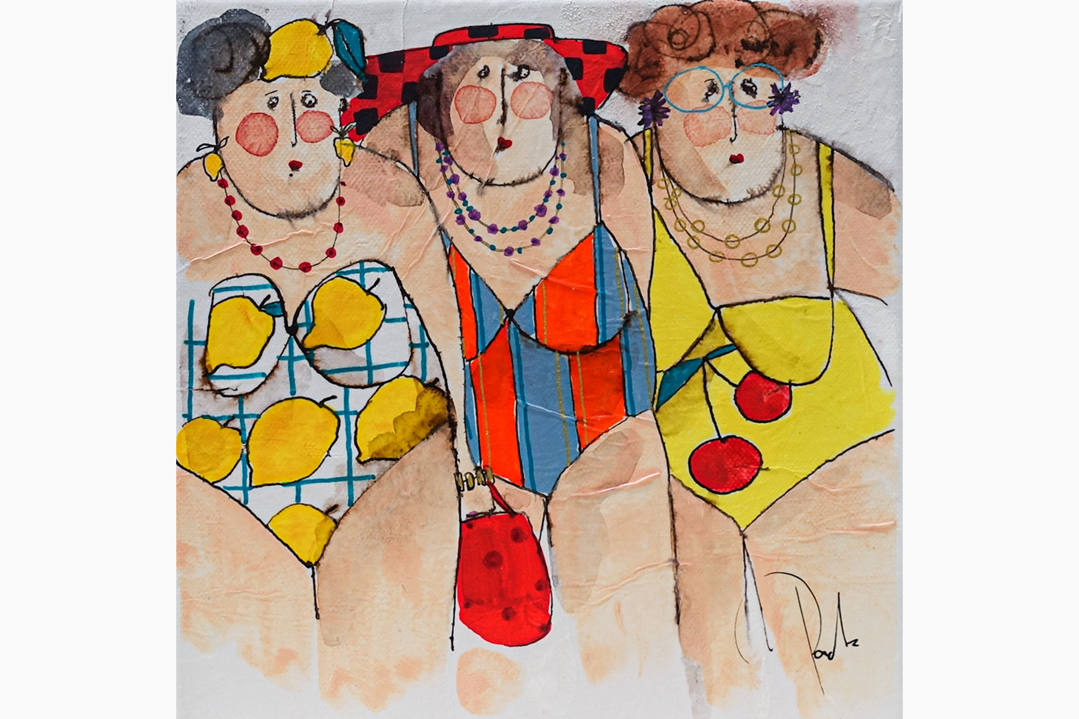 In her series of Bathers she presents women in beachwear, generous in form and well in their skin. At the gallery, the reactions of passers-by are unanimous. A painting that feels good! The artist mixes several mediums in her paintings. Collage, ink, watercolor paint and acrylic animate the painting. Cécile Colombo has fun creating motifs that take us back to the positive style of the 70s. Flashy colors, drawings of fruits, geometric patterns, flowery bathing caps …