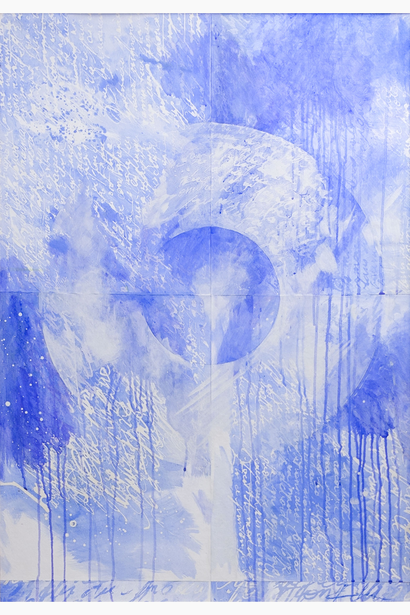 “Large Blue 16” belongs to the series of the same name. In this series of paintings on watercolour paper, M.Cohen explores the plastic characteristics of writing.