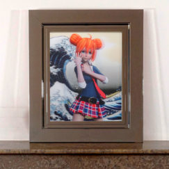 In this composition, Mulhem mixes two universes, two eras: the tradition of the Japanese print and the contemporary world of Manga. In front of “The Great Wave of Kanagawa” by the Japanese painter Hokusai, a young girl poses. She is in turn the model Japanese schoolgirl in her uniform, pleated skirt, white collar and tie, or the superheroine, a hyper-sexed young woman from the Manga universe.