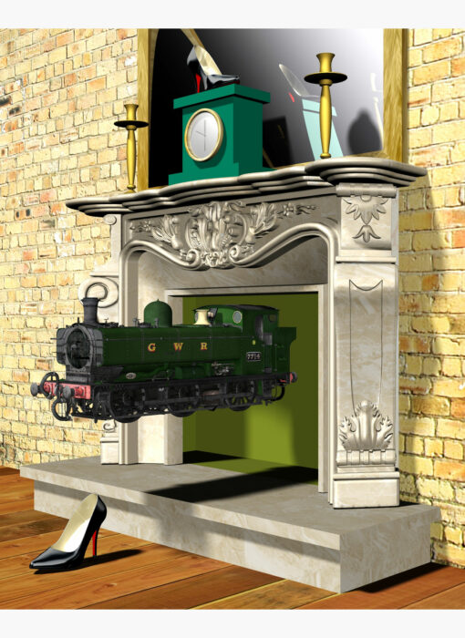 “Persistence transfixed” is very much inspired by a large oil on canvas by René Magritte painted in 1938. A locomotive appears to be passing through a chimney, next to which are Louboutin shoes, symbolic objects that recur in Mulhem’s holograms.