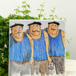 For many years she has been painting Mediterranean subjects. She is particularly known for her female figures in colourful dresses or swimming costumes. Round and flirtatious women who give a smile to all visitors of our art gallery. Occasionally she paints men. If you look closely, the male version has characters that look exactly like those in the female version. They too have outdated names. Also all round and overflowing the frame. Stunned looks off camera… Basically they are the same and they tell the same personal and family story of Cécile Colombo. The story of happy memories, the nostalgia of childhood.