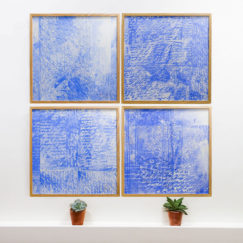 « Grand Bleu 14 » appartient à la série du même nom. Dans cette série de peintures sur papier aquarelle, M.Cohen explore les caractéristiques plastiques de l’écriture.