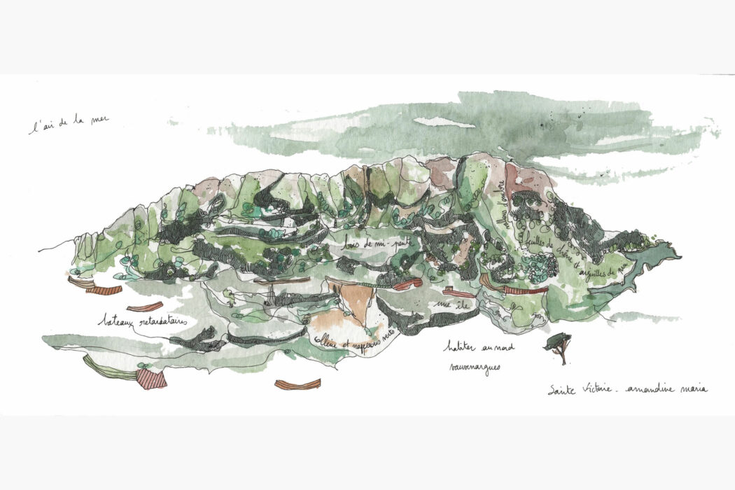 Dans sa série de montagnes Sainte-Victoire, Amandine Maria propose une vision de cartographe et poétesse. Elle emprunte à la tradition cartographique le tracé de l’esquisse, qui découpe la silhouette d’une chaine de montagnes et renseigne les noms de sommets. L’artiste ajoute des commentaires textuels qui accompagnent ce tracé délicat et dynamique à la fois. Elle peint surtout des détails : oliviers, hêtres, pins et chênes. Langues de terres, cours d’eau, champs, morceaux de ciel.