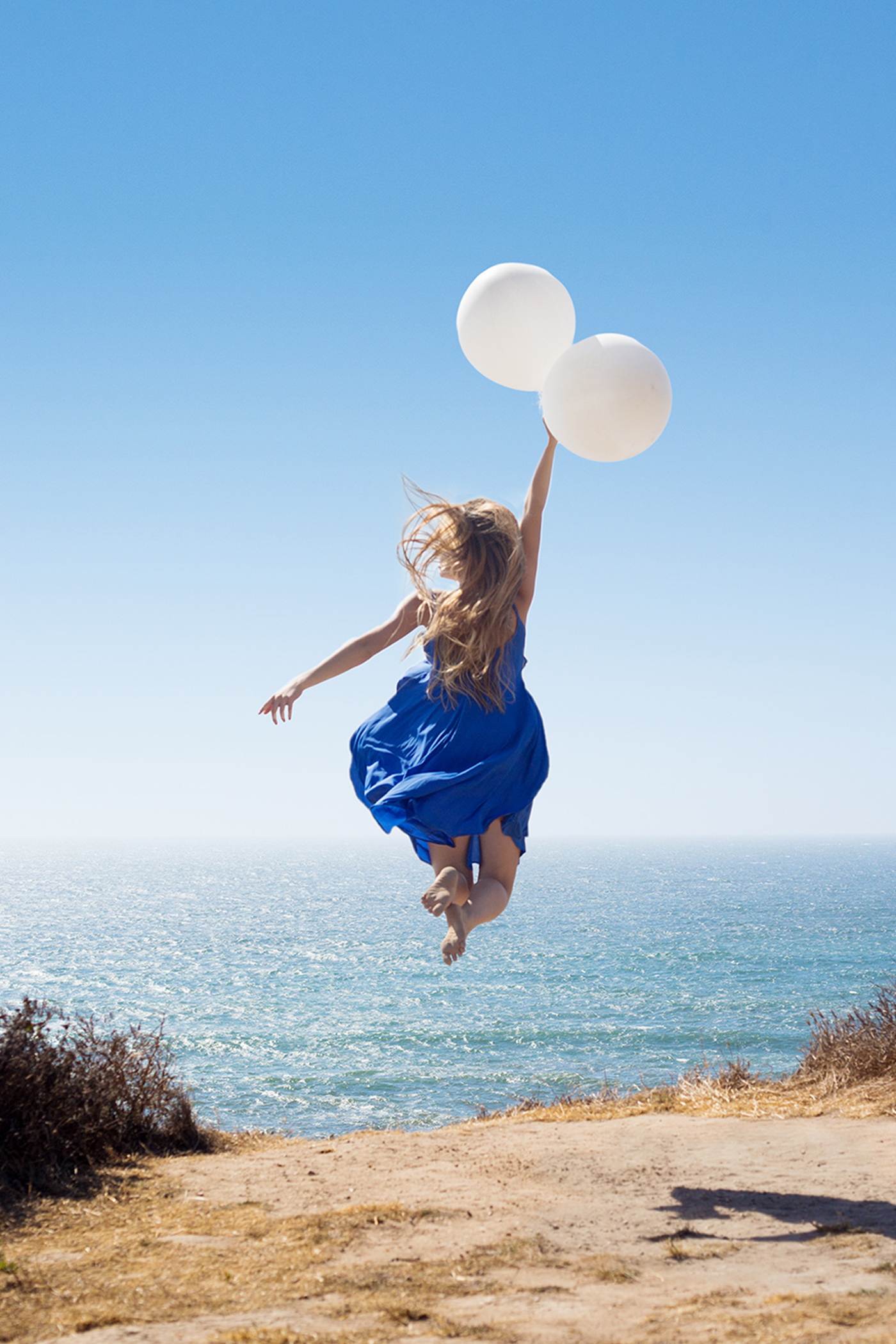 « Wonderful Journey – robe bleue » est un autoportrait traversé par une énergie communicative. L’air, la terre, l’eau et le feu d’un franc soleil accompagnent la vitalité du sujet. On voudrait y être aussi !